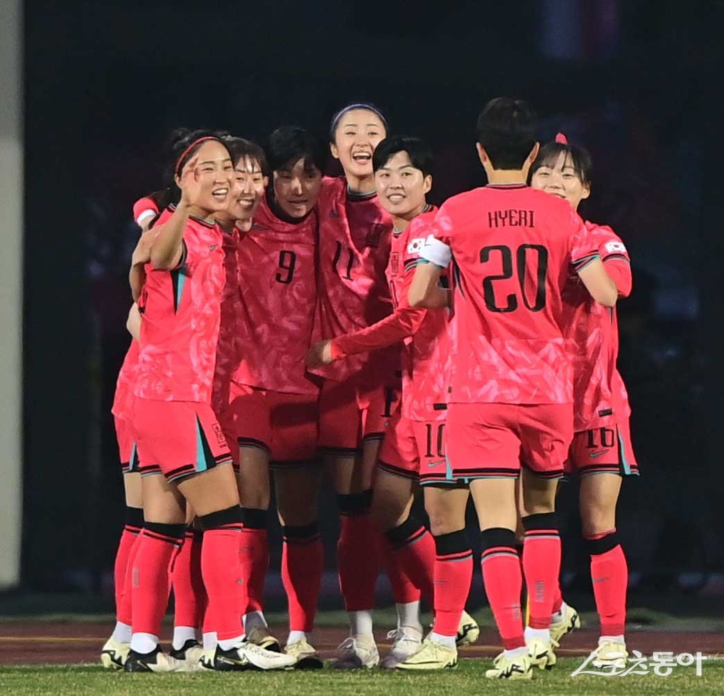 8일 경기도 이천종합운동장에서 열린 ‘신세계 이마트 초청 여자축구국가대표팀 친선경기’ 한국과 필리핀의 경기에서 한국 추효주(왼쪽 두 뻔째)가 선제골을 성공시킨 후 동료들과 기쁨을 나누고 있다.