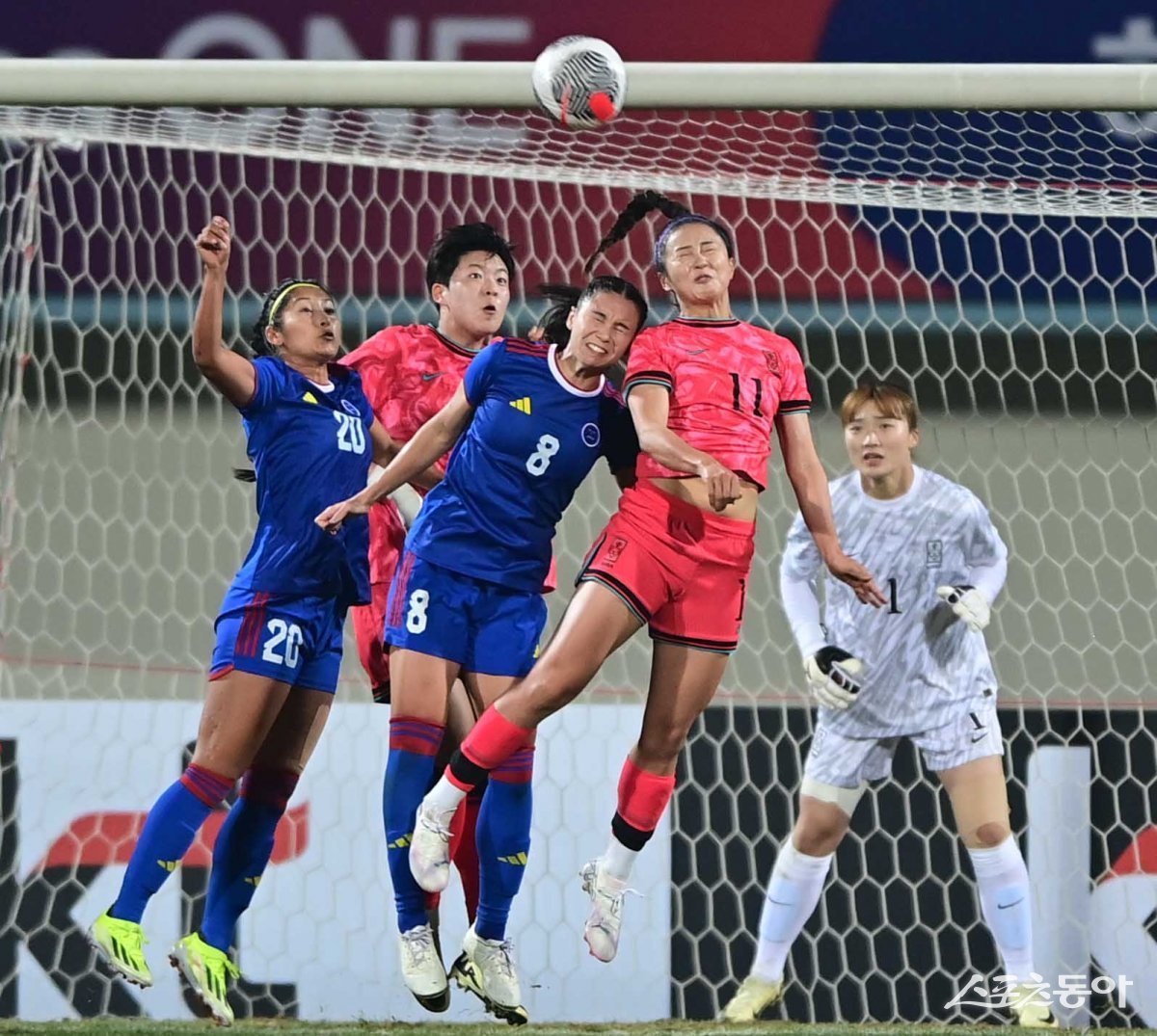 8일 경기도 이천종합운동장에서 열린 ‘신세계 이마트 초청 여자축구국가대표팀 친선경기’ 한국과 필리핀의 경기에서 한국 최유리가 필리핀 공격수와 헤딩 경합을 하고 있다.