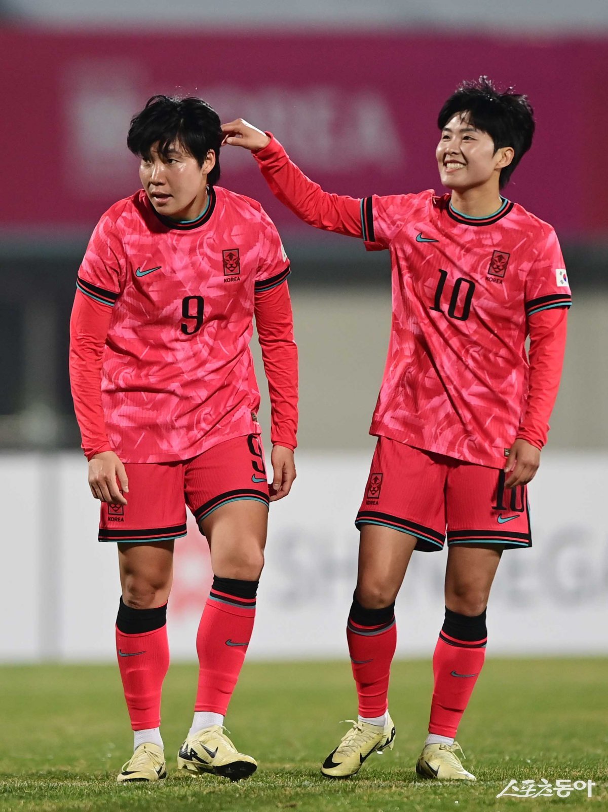 8일 경기도 이천종합운동장에서 열린 ‘신세계 이마트 초청 여자축구국가대표팀 친선경기’ 한국과 필리핀의 경기에서 골찬스를 놓친 한국 이금민을 지소연이 격려하고 있다.