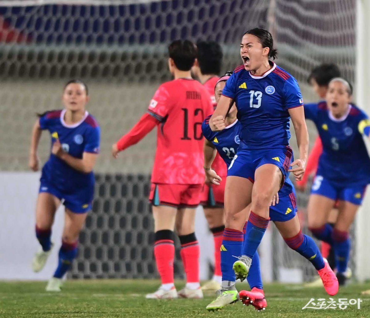 8일 경기도 이천종합운동장에서 열린 ‘신세계 이마트 초청 여자축구국가대표팀 친선경기’ 한국과 필리핀의 경기에서 필리핀 비어드가 팀 첫 번째 골을 성공시킨 후 세리머니를 하고 있다.