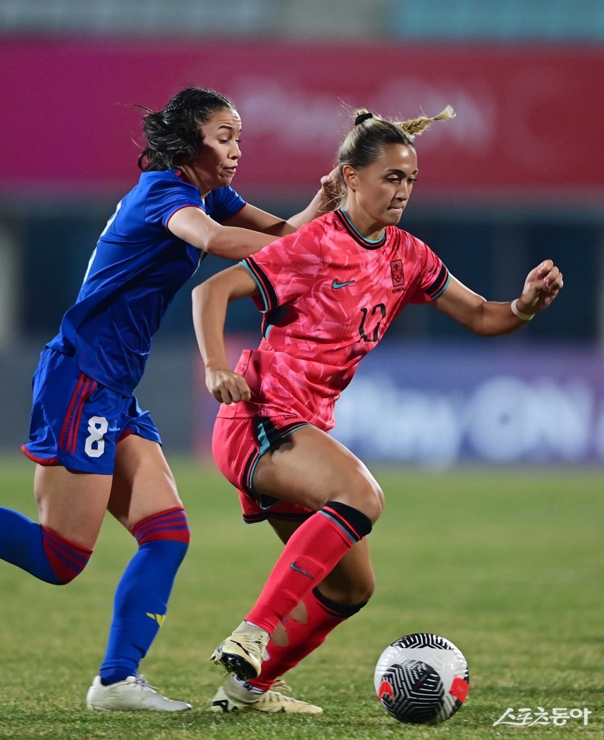 8일 경기도 이천종합운동장에서 열린 ‘신세계 이마트 초청 여자축구국가대표팀 친선경기’ 한국과 필리핀의 경기에서 한국 케이시가 필리핀 수비를 뚫고 드리블 돌파를 하고 있다.