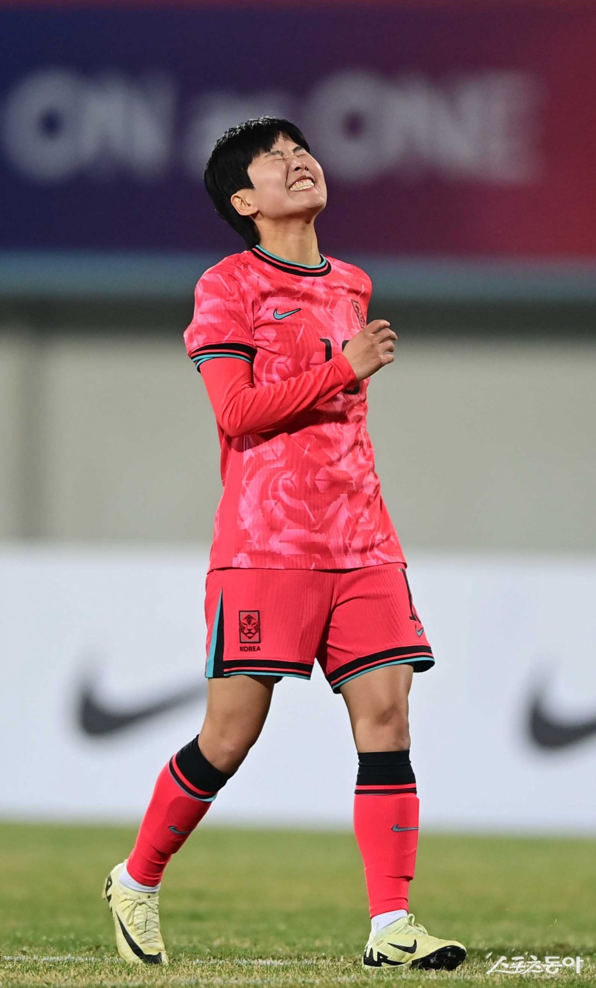 8일 경기도 이천종합운동장에서 열린 ‘신세계 이마트 초청 여자축구국가대표팀 친선경기’ 한국과 필리핀의 경기에서 골찬스를 놓친 한국 지소연이 아쉬워하고 있다.
