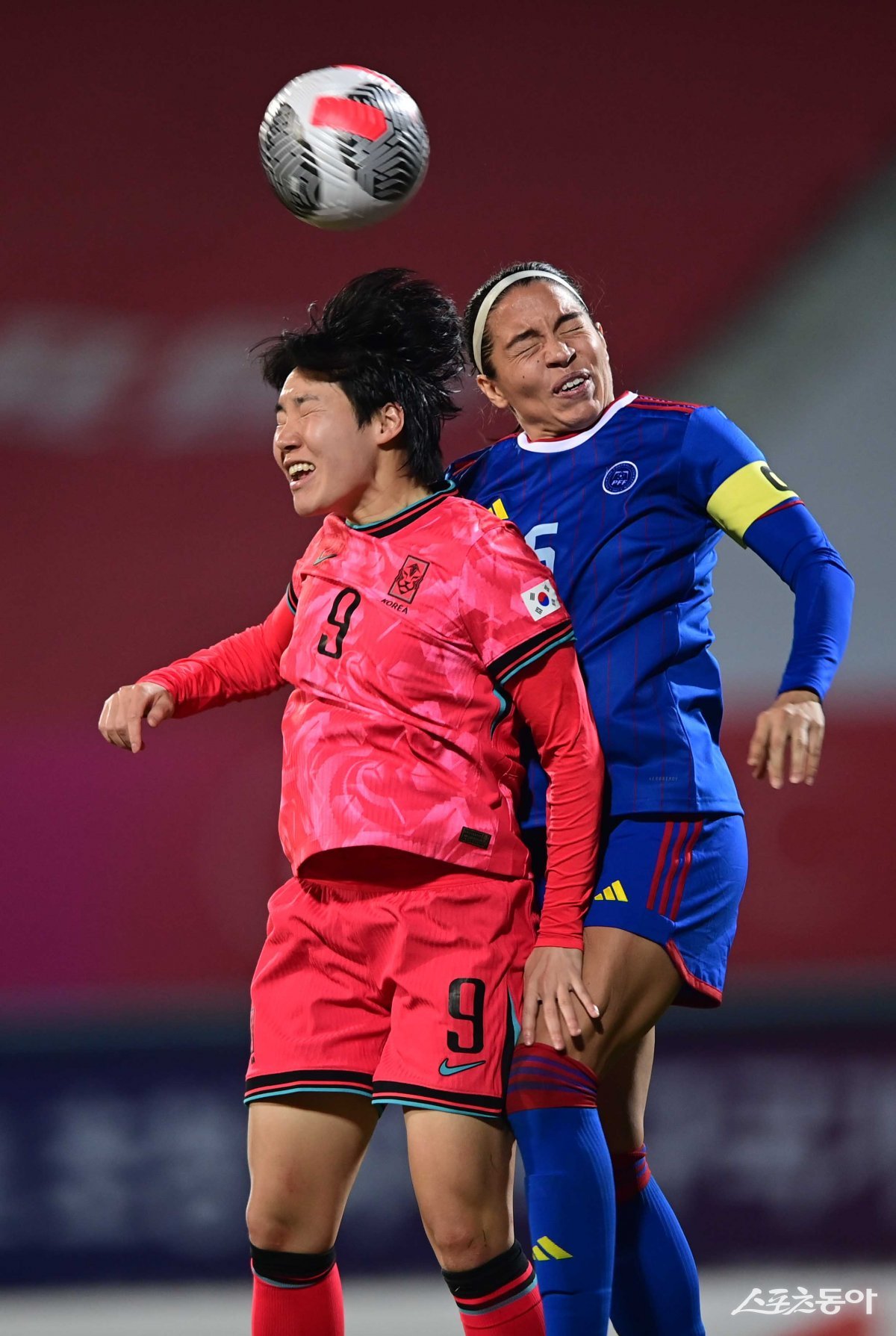 8일 경기도 이천종합운동장에서 열린 ‘신세계 이마트 초청 여자축구국가대표팀 친선경기’ 한국과 필리핀의 경기에서 한국 이금민이 필리핀 수비수와 헤딩 경합을 하고 있다.