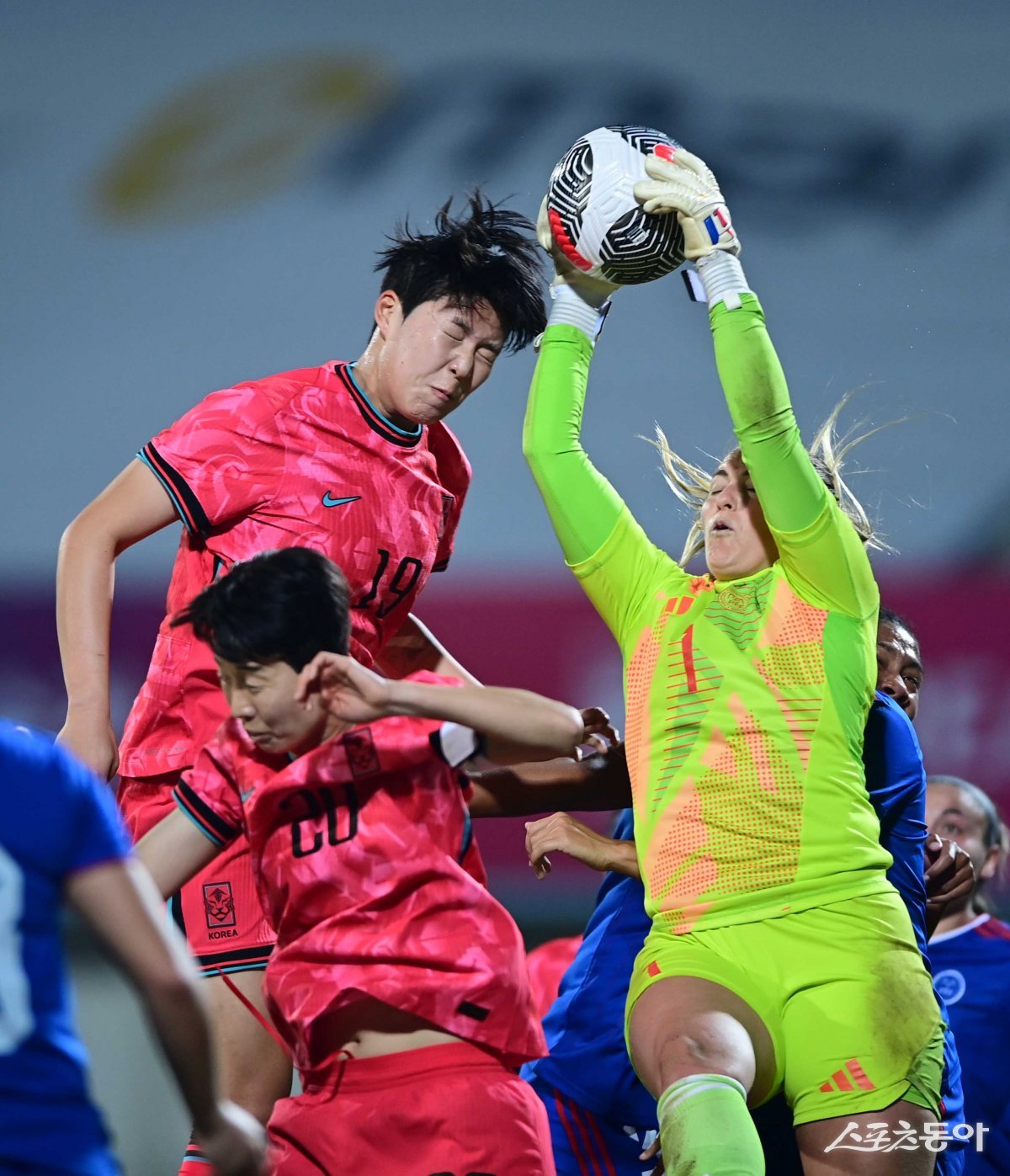 8일 경기도 이천종합운동장에서 열린 ‘신세계 이마트 초청 여자축구국가대표팀 친선경기’ 한국과 필리핀의 경기에서 한국 고유나가 헤딩을 하고 있다.