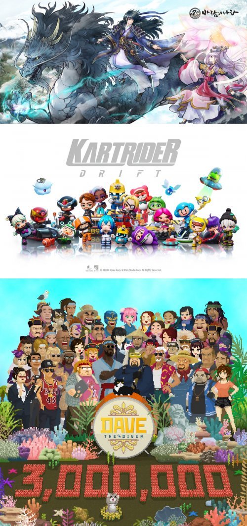 국내 최초 온라인 그래픽 MMORPG ‘바람의 나라’, 국민 레이싱 게임 ‘카트라이더’를 잇는 ‘카트라이더: 드리프트’, 향후 30년을 위한 변화의 선봉에 선 ‘데이브 더 다이버’(위 사진부터). 사진제공|넥슨