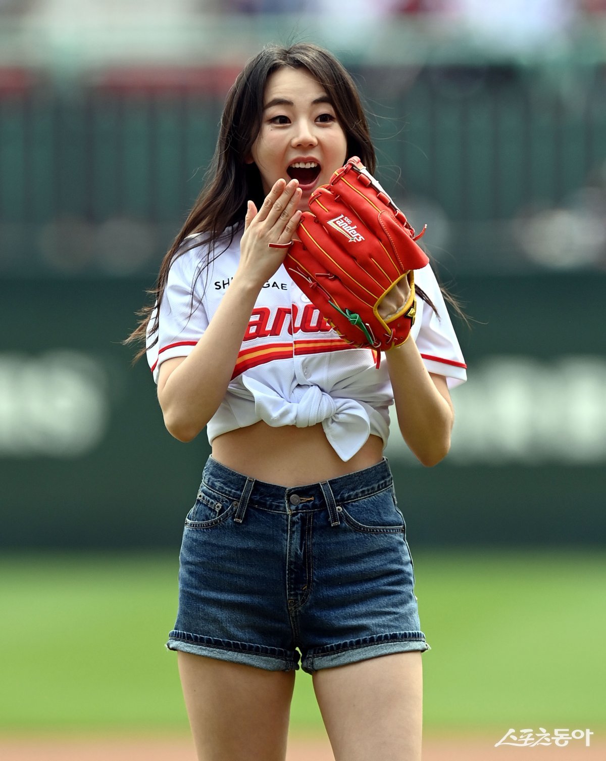 10일 인천 SSG 랜더스필드에서 ‘2024 신한 SOL 뱅크 KBO리그’ SSG 랜더스와 키움 히어로즈의 경기가 열렸다. 경기 전 배우 안소희가 SSG 승리 기원 시구 후 놀라고 있다.