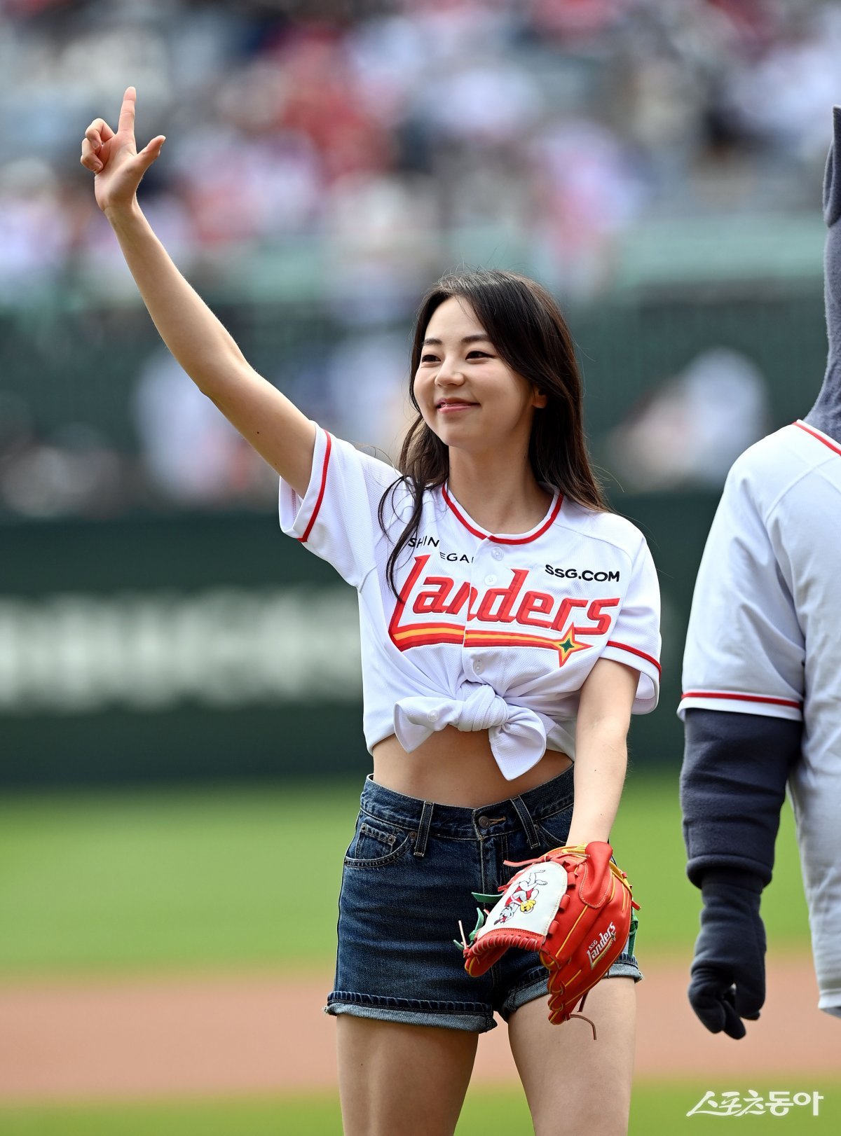 10일 인천 SSG 랜더스필드에서 ‘2024 신한 SOL 뱅크 KBO리그’ SSG 랜더스와 키움 히어로즈의 경기가 열렸다. 경기 전 배우 안소희가 SSG 승리 기원 시구 후 세리머니를 펼치고 있다.