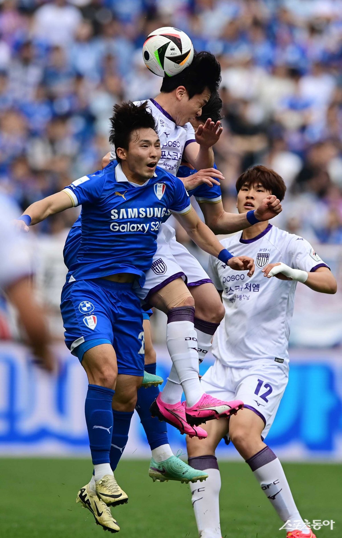 10일 경기도 수원월드컵경기장에서 열린 ‘하나은행 2024 K리그2’ 수원 삼성과 전남 드래곤즈의 경기에서 수원 이시영과 전남 임찬울이 헤딩 경합을 하고 있다.