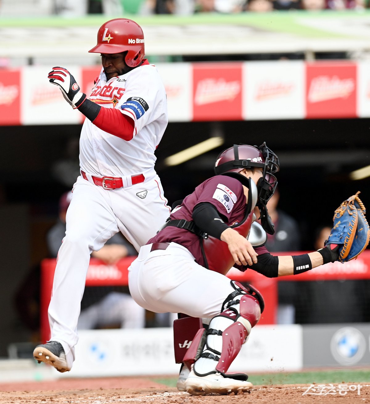 10일 인천 SSG 랜더스필드에서 ‘2024 신한 SOL 뱅크 KBO리그’ SSG 랜더스와 키움 히어로즈의 경기가 열렸다. 7회말 2사 1, 2루에서 적시타 때 SSG 에레디아가 득점을 올리고 있다.
