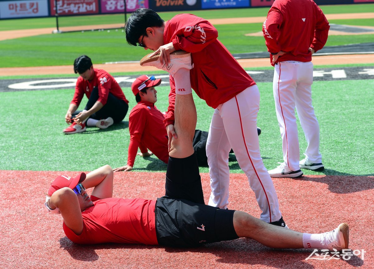 14일 경기도 수원 KT위즈파크에서 ‘2024 신한 SOL 뱅크 KBO리그’ KT 위즈와 SSG 랜더스의 경기가 열린다. 경기 전 SSG 한유섬이 트레이너로부터 스트레칭을 하고 있다.