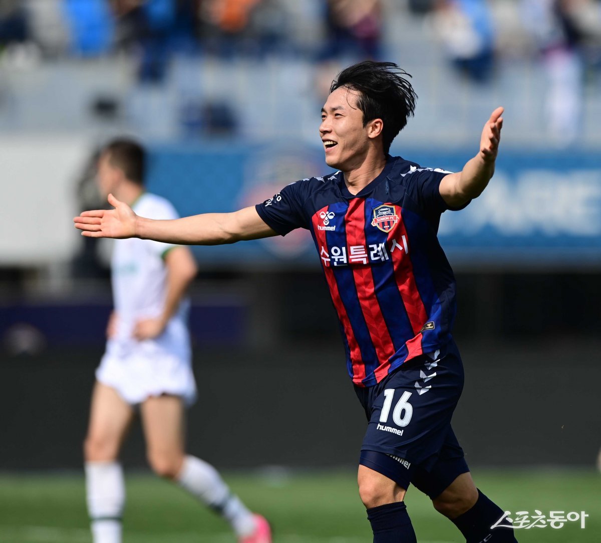 14일 경기도 수원종합운동장에서 열린 ‘하나은행 2024 K리그1’ 수원 FC와 대전 하나의 경기에서 수원FC 이재원이 선제골을 성공시킨 후 세리머니를 하고 있다.