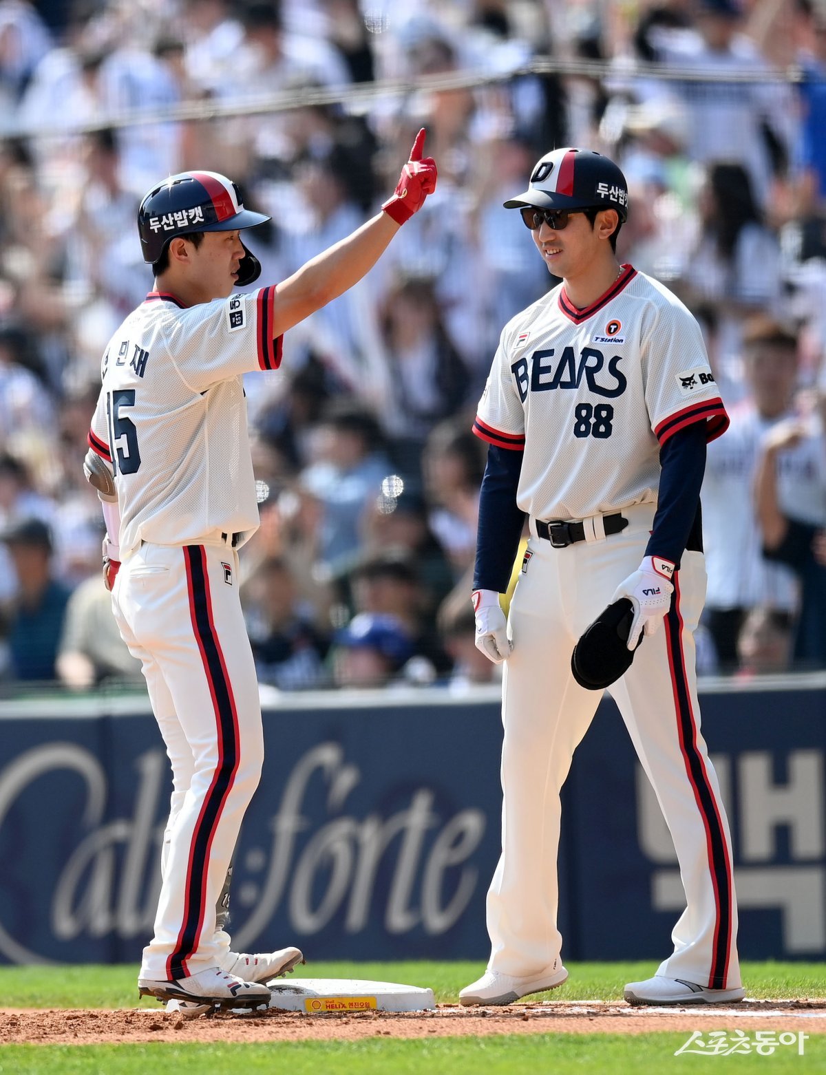 14일 서울 잠실야구장에서 ‘2024 신한은행 SOL뱅크 KBO리그’ LG 트윈스와 두산 베어스 경기가 열렸다. 2회말 2사 3루 두산 전민재가 동점 적시타를 치고 1루에서 기뻐하고 있다.