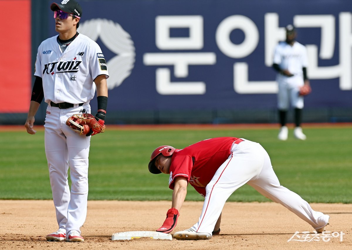 14일 경기도 수원 KT위즈파크에서 ‘2024 신한 SOL 뱅크 KBO리그’ KT 위즈와 SSG 랜더스의 경기가 열렸다. 4회초 2사 1루에서 SSG 이지영이 2루 도루를 성공시키고 있다.
