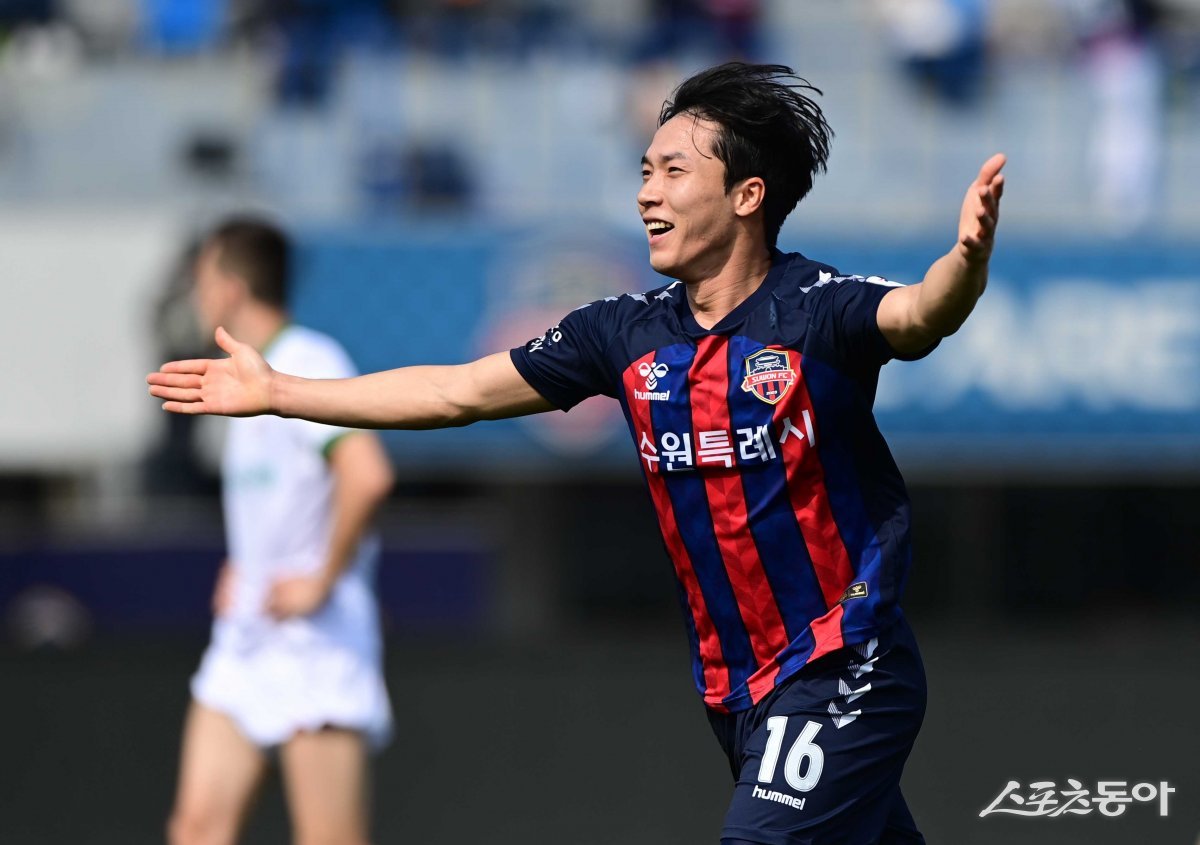 14일 경기도 수원종합운동장에서 열린 ‘하나은행 2024 K리그1’ 수원 FC와 대전 하나의 경기에서 수원FC 이재원이 선제골을 성공시킨 후 세리머니를 하고 있다. 수원 | 주현희 기자 teth1147@donga.com