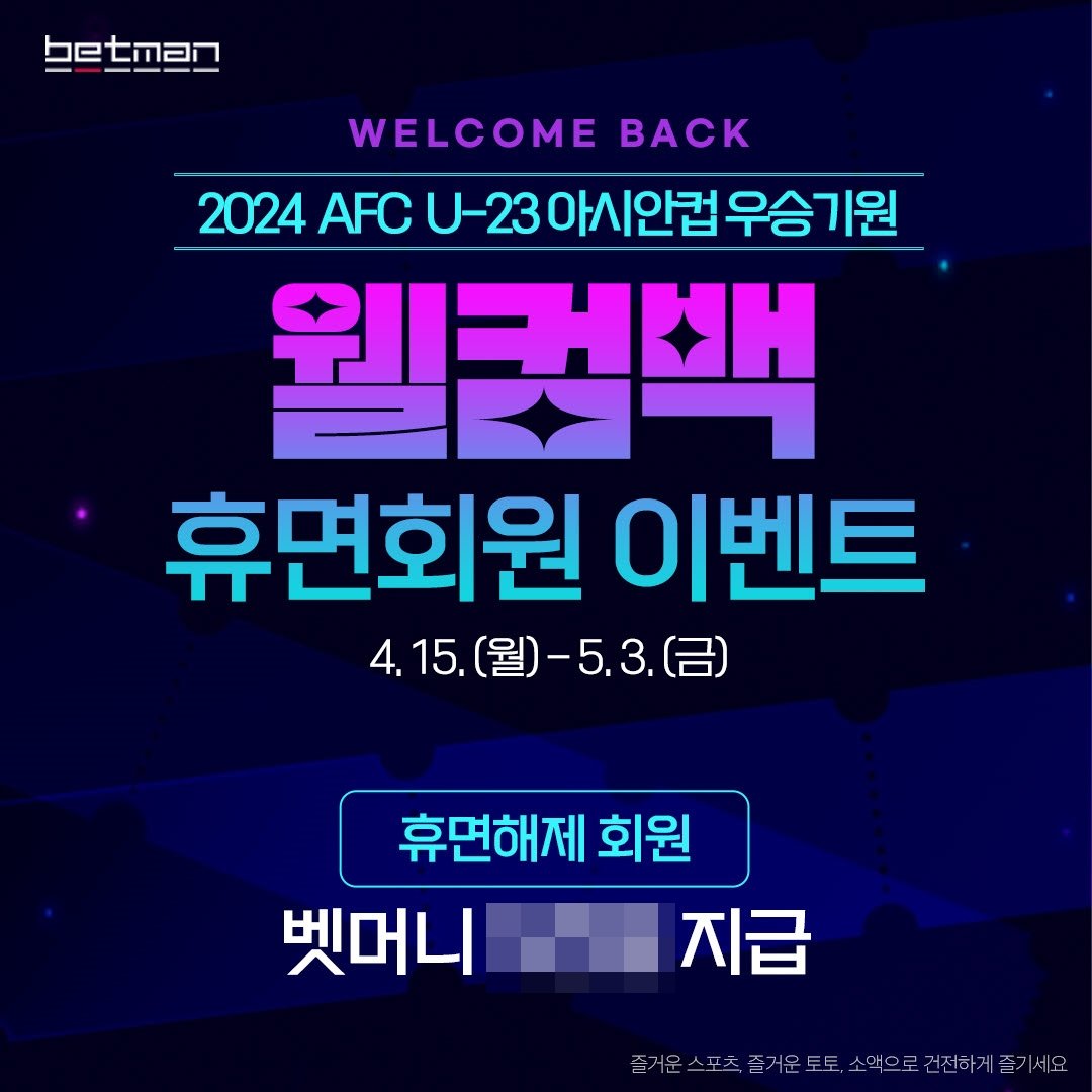 국민체육진흥공단에서 발행하는 체육진흥투표권 스포츠토토의 수탁사업자 스포츠토토코리아가 2024 아시아축구연맹(AFC) U-23 아시안컵이 열리는 4월 15일(월)부터 5월 3일(금)까지 대한민국축구대표팀의 우승을 기원하는 ‘웰컴백 휴면회원’ 이벤트를 전개한다.베트맨 휴면 해제 회원 전원에게 벳머니 지급
