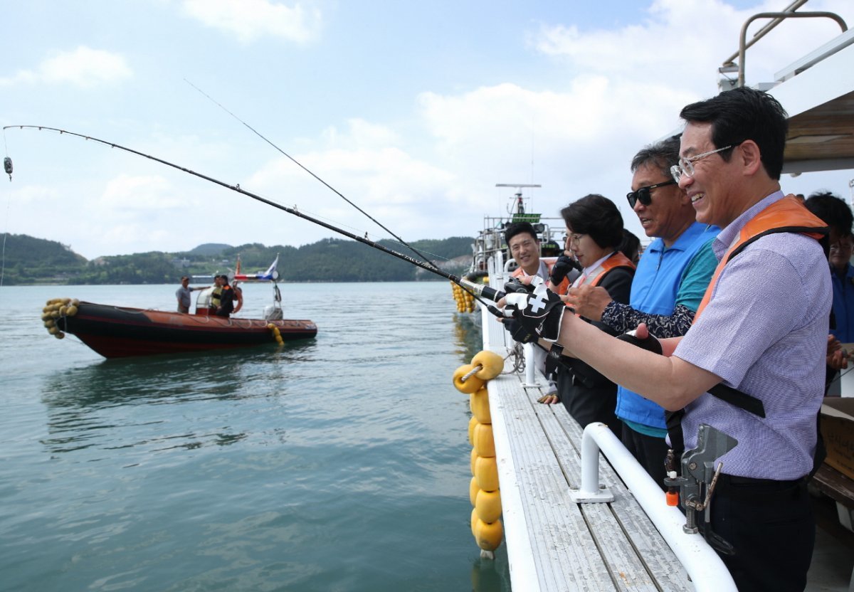 지난 2023년 6월 22일 마량항 바다낚시 어선 출항식에서 바다낚시를 하고 있는 강진원 강진군수. 사진제공 | 강진군