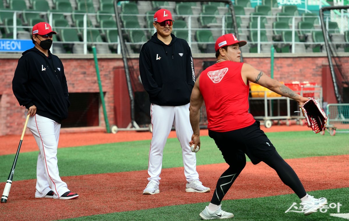 16일 인천 SSG 랜더스필드에서 ‘2024 신한 SOL 뱅크 KBO리그’ SSG 랜더스와 KIA 타이거즈의 경기가 열린다. 경기 전 SSG 이숭용 감독과 송신영 코치가 추신수의 투구 연습을 지켜보고 있다.