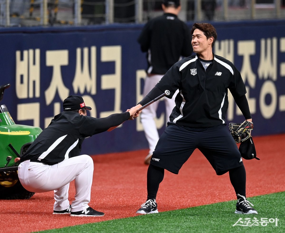 16일 서울 고척스카이돔에서 ‘2024 신한은행 SOL뱅크 KBO리그’ KT 위즈와 키움 히어로즈 경기가 열린다. KT 박경수가 코치의 스트레칭을 도와주고 있다. 고척 | 김종원 기자 won@donga.com