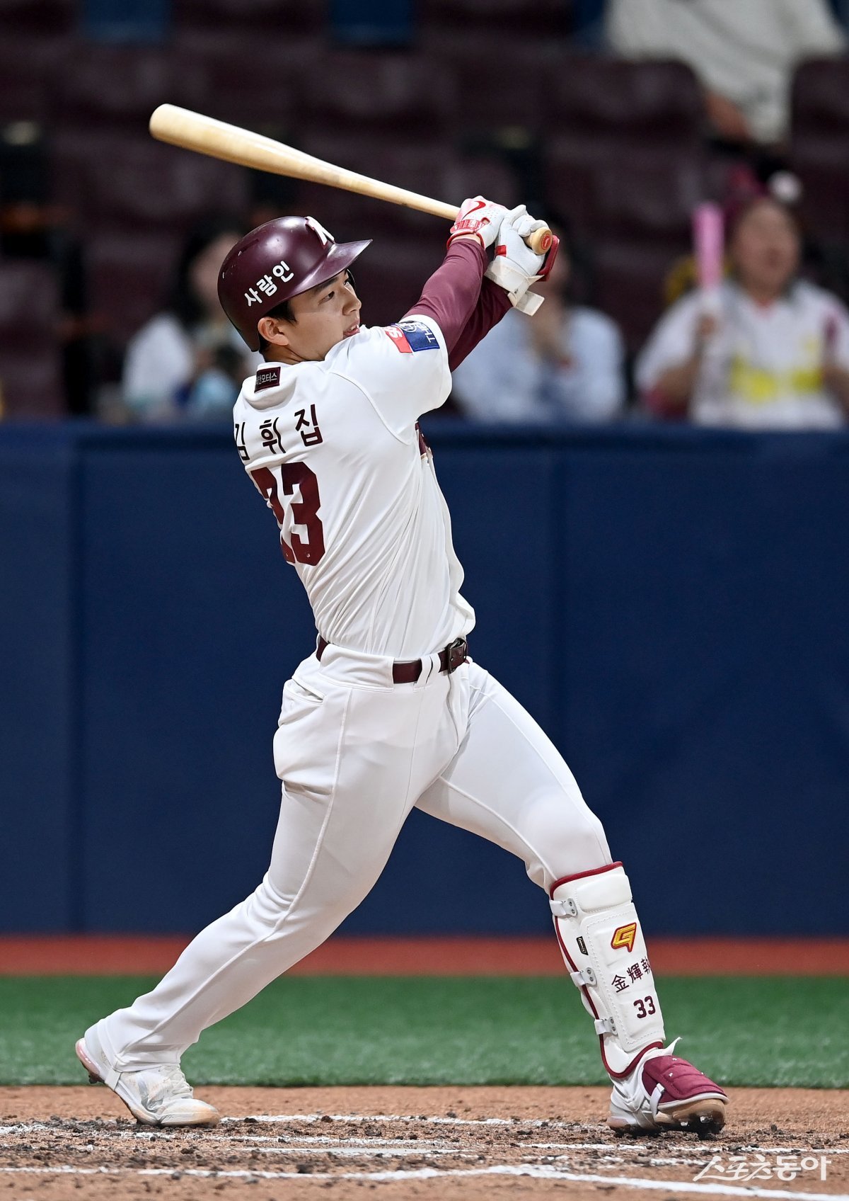 16일 서울 고척스카이돔에서 ‘2024 신한은행 SOL뱅크 KBO리그’ KT 위즈와 키움 히어로즈 경기가 열렸다. 4회말 1사 1루 키움 김휘집이 중전 안타를 치고 있다.