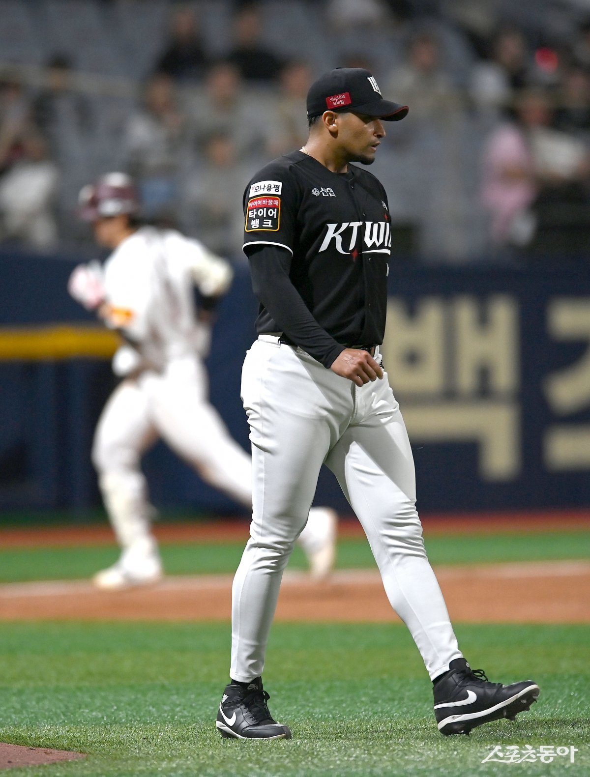 16일 서울 고척스카이돔에서 ‘2024 신한은행 SOL뱅크 KBO리그’ KT 위즈와 키움 히어로즈 경기가 열렸다. KT 선발 쿠에바스가 3회말 1사 1루 키움 김혜성에게 우중월 투런 홈런을 허용하고 있다.