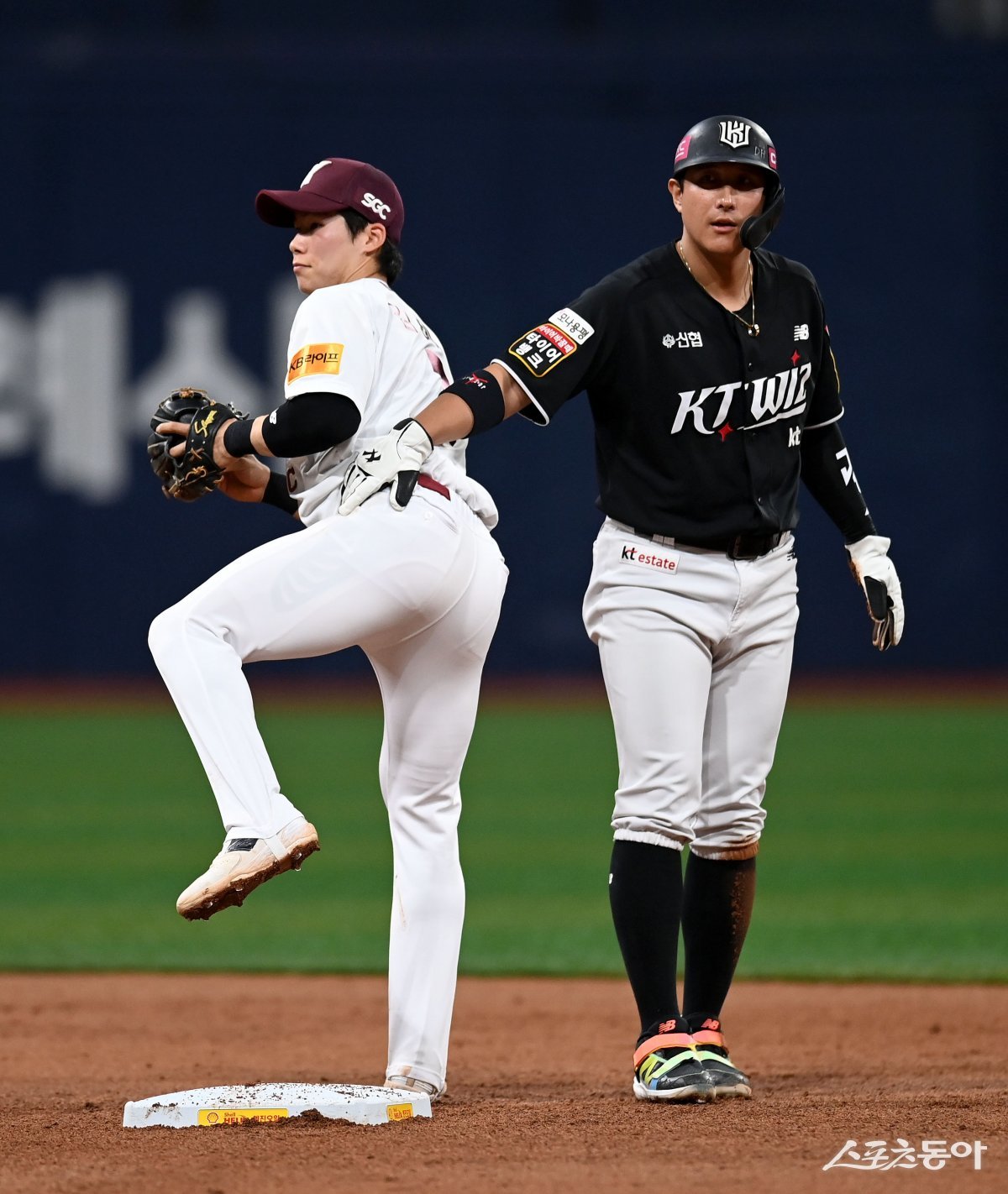 16일 서울 고척스카이돔에서 ‘2024 신한은행 SOL뱅크 KBO리그’ KT 위즈와 키움 히어로즈 경기가 열렸다. 2회초 1사 1,2루 KT 내야 땅볼 때 1루주자 황재균이 2루에서 포스 아웃되고 있다.