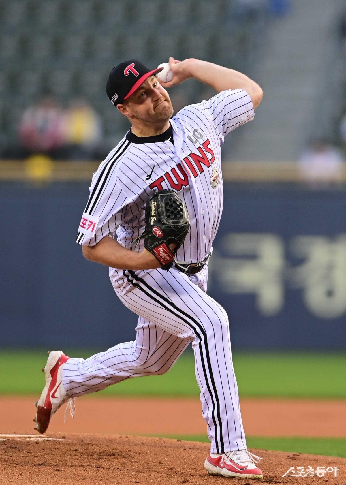 16일 서울 잠실야구장에서 열린 ‘2024 신한 SOL 뱅크 KBO리그’ LG 트윈스와 롯데 자이언츠의 경기에서 LG 선발 투수 엔스가 마운드에 올라 역투하고 있다.