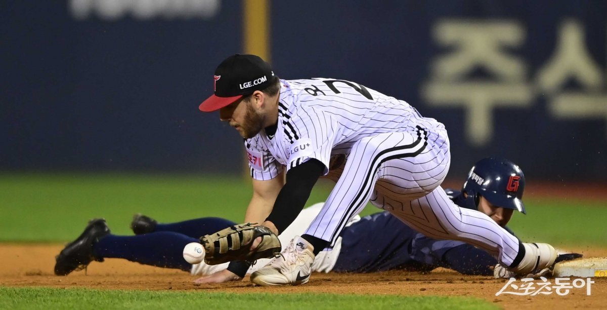 16일 서울 잠실야구장에서 열린 ‘2024 신한 SOL 뱅크 KBO리그’ LG 트윈스와 롯데 자이언츠의 경기에서 7회초 무사 1루 롯데의 뜬공 때 LG 1루수 오스틴이 송구된 볼을 놓치고 있다.