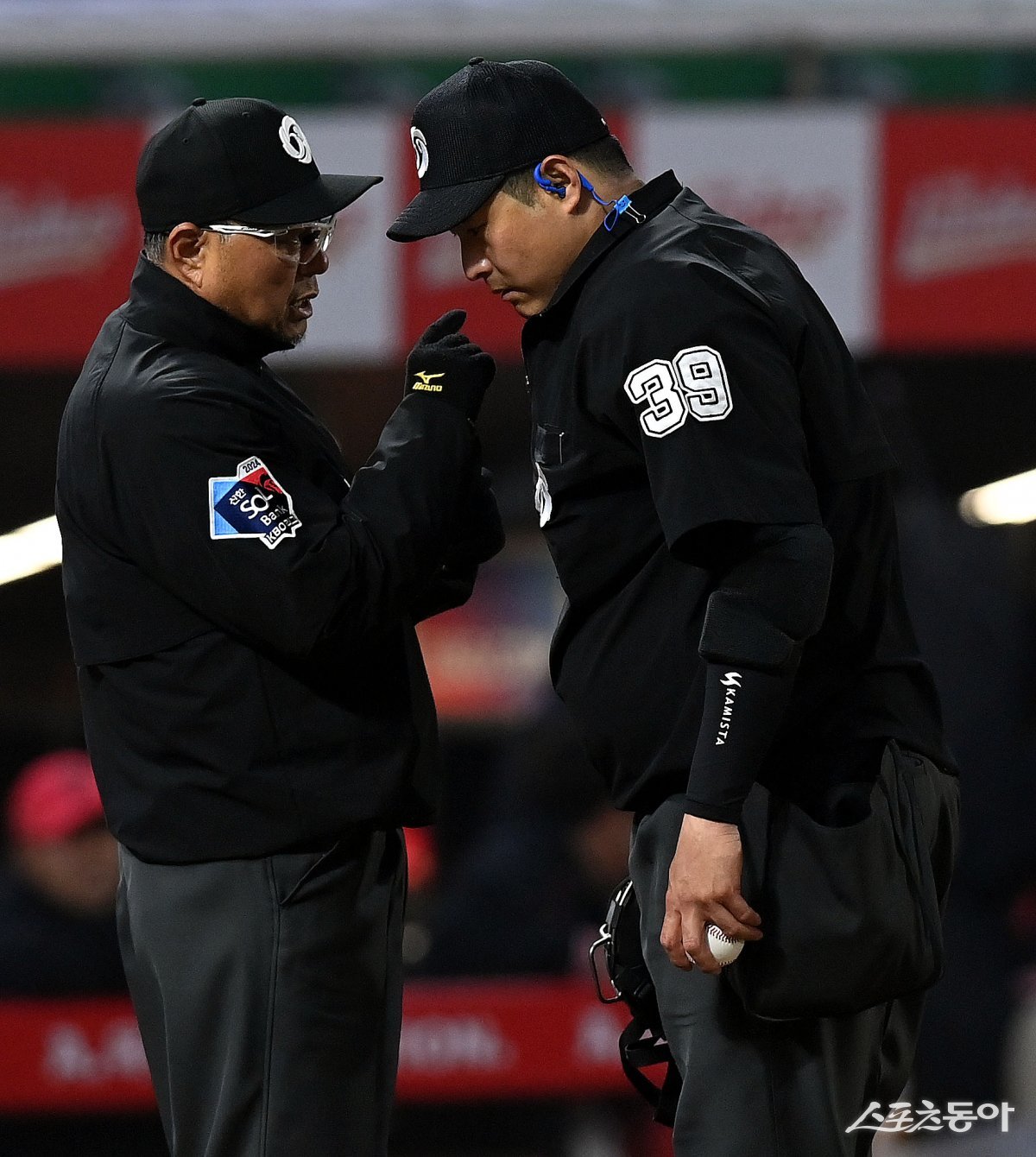 16일 인천 SSG 랜더스필드에서 ‘2024 신한 SOL 뱅크 KBO리그’ SSG 랜더스와 KIA 타이거즈의 경기가 열렸다. KBO 구명환 주심과 이영재 3루심이 이야기를 나누고 있다.