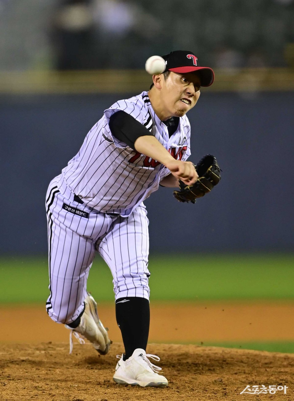 16일 서울 잠실야구장에서 열린 ‘2024 신한 SOL 뱅크 KBO리그’ LG 트윈스와 롯데 자이언츠의 경기에서 8회초 LG 박명근이 교체로 마운드에 올라 역투하고 있다.