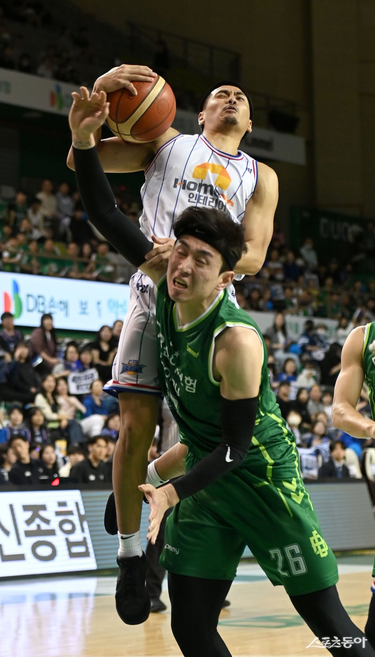 17일 원주종합체육관에서 열린 ‘2023-2024 프로농구’ 4강 플레이오프 2차전 DB와 KCC 경기에서 KCC 에피스톨라가 리바운드를 하고 있다.