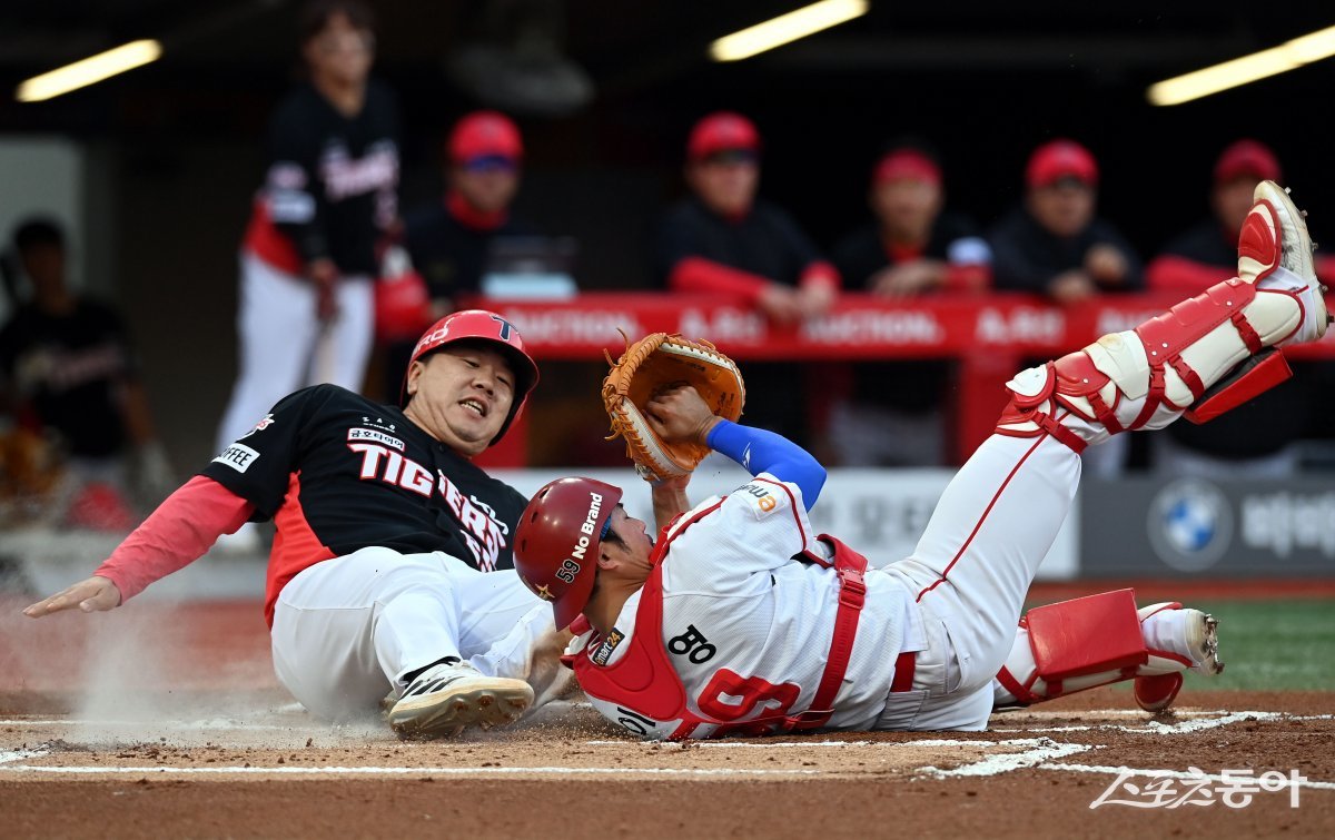 17일 인천 SSG 랜더스필드에서 ‘2024 신한 SOL 뱅크 KBO리그’ SSG 랜더스와 KIA 타이거즈의 경기가 열렸다. 1회초 2, 3루에서 적시타 때 KIA 2루 주자 이우성이 홈 득점을 노렸으나 SSG 이지영에게 태그 아웃되고 있다.