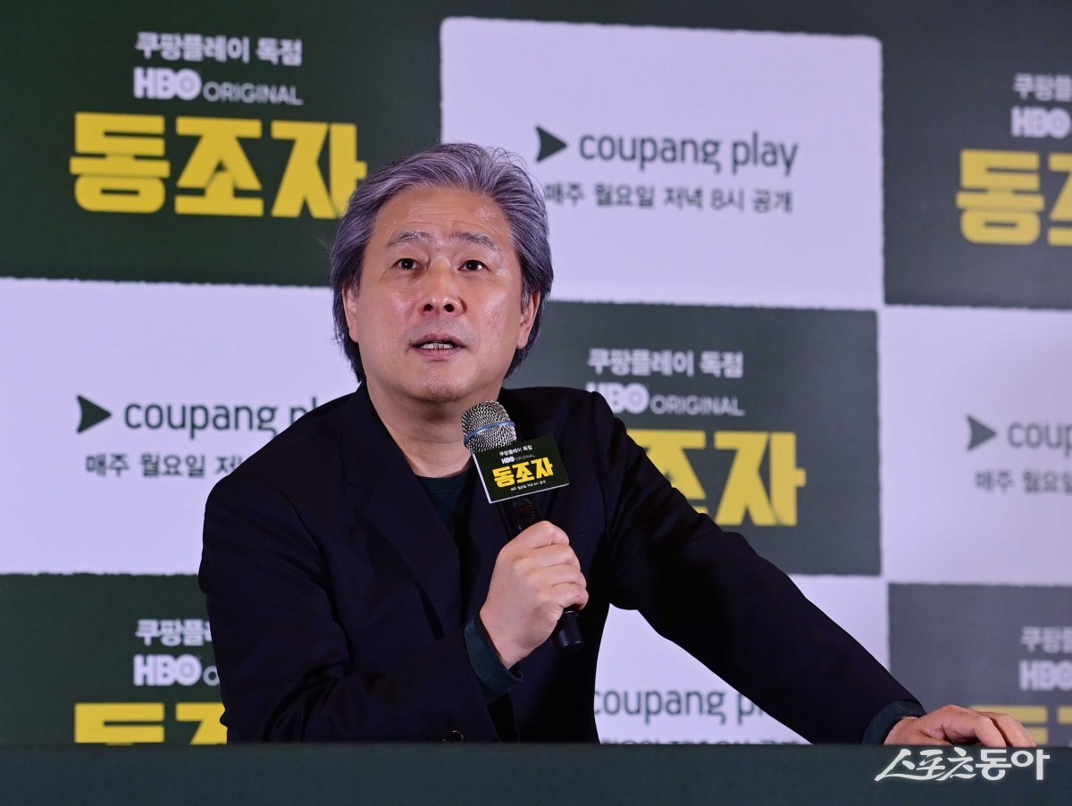 박찬욱 감독이 18일 서울 강남구 삼성동 메가박스 코엑스점에서 열린 쿠팡플레이 독점 HBO 오리지널 시리즈 ‘동조자’ 언론시사회 및 기자간담회에서 인사말을 하고 있다.