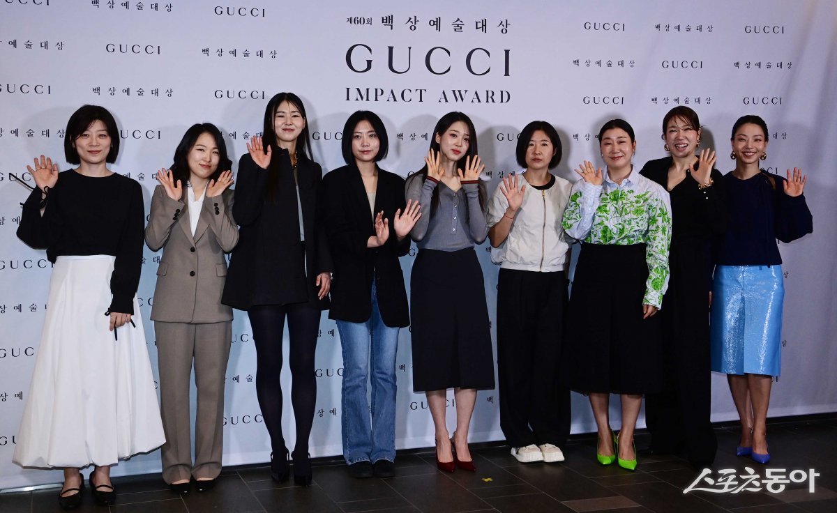 감독 임선애, 이지은, 배우 임선우, 감독 이솔희, 배우 김시은, 안보영 PD, 배우 라미란, 염혜란, 김신록이 21일 서울 성동구 성수동 메가박스 성수점에서 열린 ‘60회 백상예술대상 구찌 임팩트 어워드 GUEST VISIT’ 포토월에서 포즈를 취하고 있다.