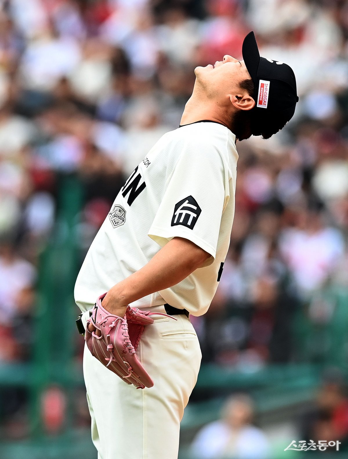21일 인천 SSG 랜더스필드에서 ‘2024 신한 SOL 뱅크 KBO리그’ SSG 랜더스와 LG 트윈스의 DH 1차전 경기가 열렸다. 7회초 2사 만루에서 내야안타를 허용한 SSG 노경은이 아쉬워하고 있다.