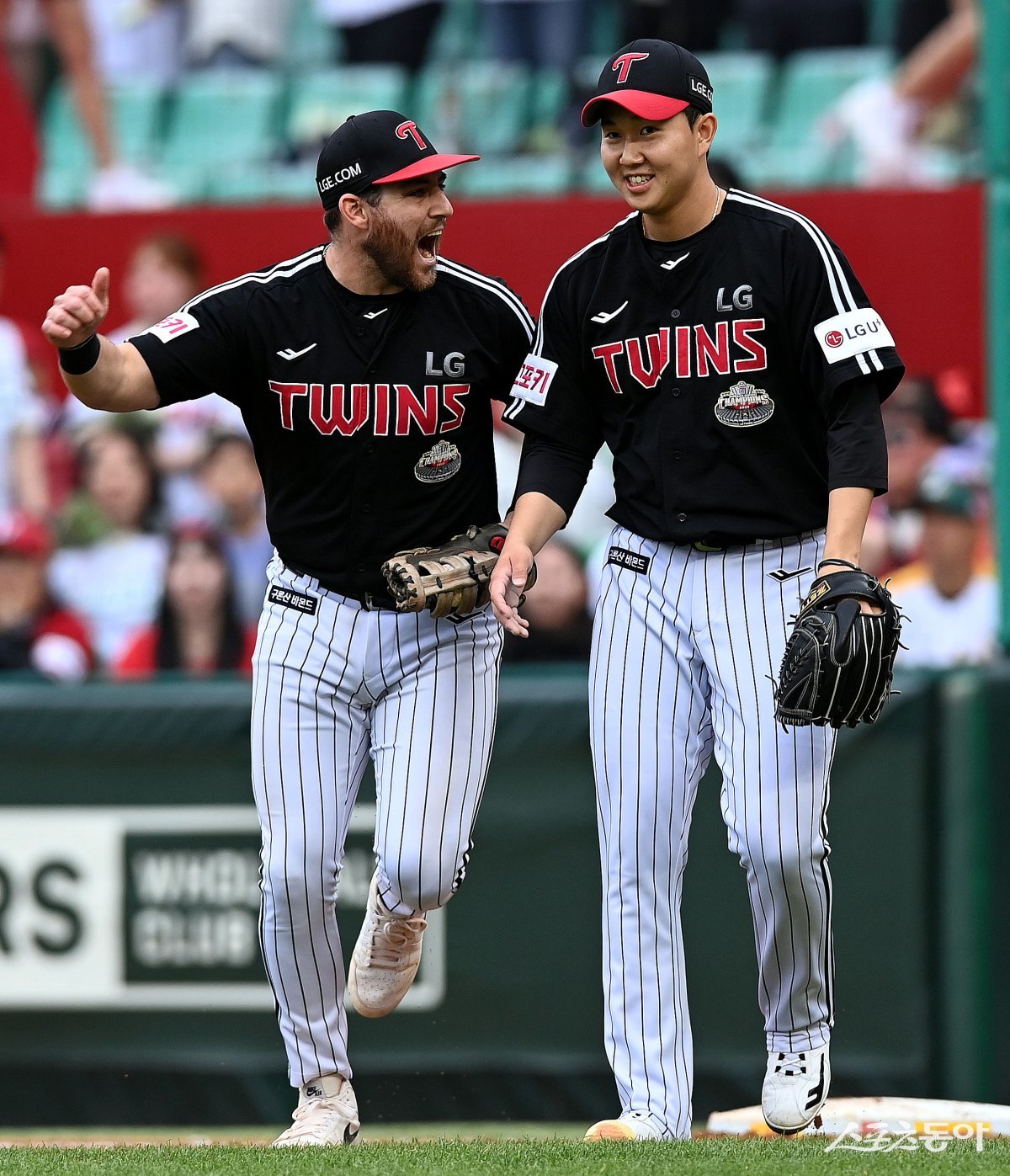21일 인천 SSG 랜더스필드에서 ‘2024 신한 SOL 뱅크 KBO리그’ SSG 랜더스와 LG 트윈스의 DH 1차전 경기가 열렸다. 8회말 2사 만루에서 구원 등판해 실점없이 SSG 공격을 막은 LG 마무리 유영찬이 오스틴과 기쁨을 나누고 있다.