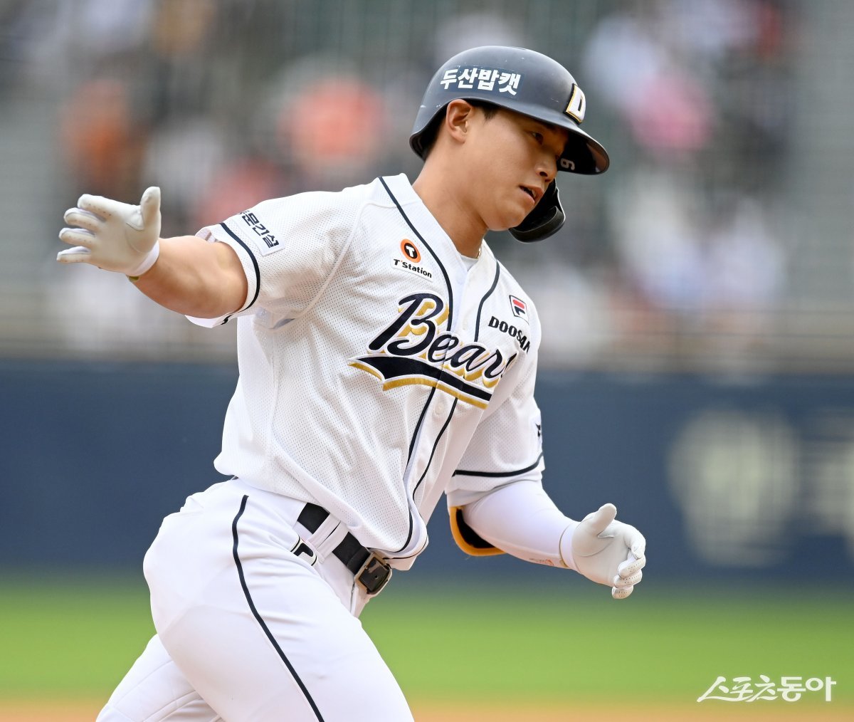 21일 서울 잠실야구장에서 ‘2024 신한은행 SOL뱅크 KBO리그’ 키움 히어로즈와 두산 베어스의 더블헤더 1차전 경기가 열렸다. 7회말 2사 두산 박준영이 좌월 솔로 홈런을 날린 후 그라운드를 돌며 하이파이브 하고 있다.