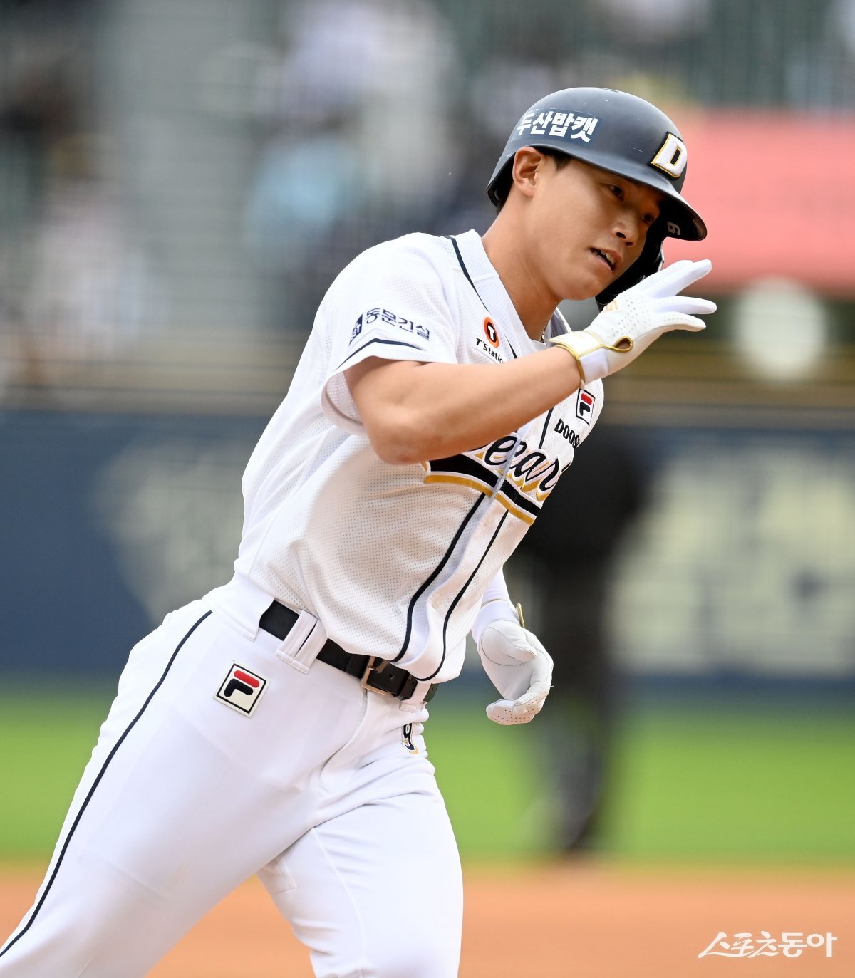 21일 서울 잠실야구장에서 ‘2024 신한은행 SOL뱅크 KBO리그’ 키움 히어로즈와 두산 베어스의 더블헤더 1차전 경기가 열렸다. 7회말 2사 두산 박준영이 좌월 솔로 홈런을 날린 후 그라운드를 돌며 하이파이브 하고 있다.