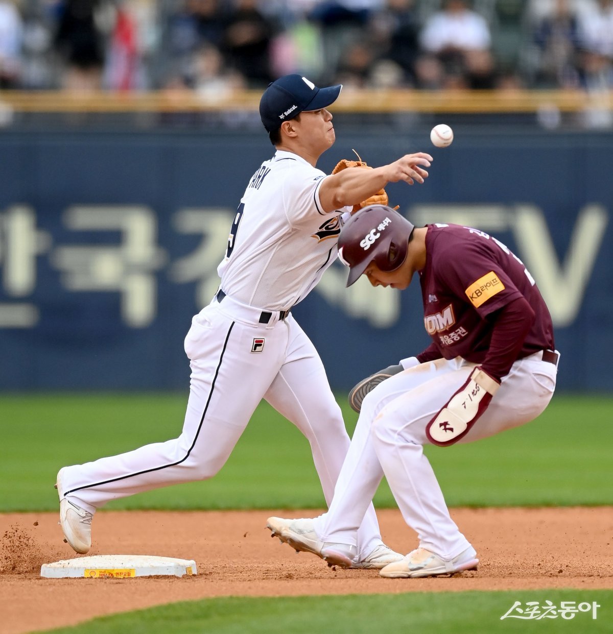 21일 서울 잠실야구장에서 ‘2024 신한은행 SOL뱅크 KBO리그’ 키움 히어로즈와 두산 베어스의 DH 1차전 경기가 열렸다. 6회초 1사 1루 키움 내야 땅볼 때 두산 박준영이 1루주자를 포스 아웃시킨 후 1루로 송구하고 있다.