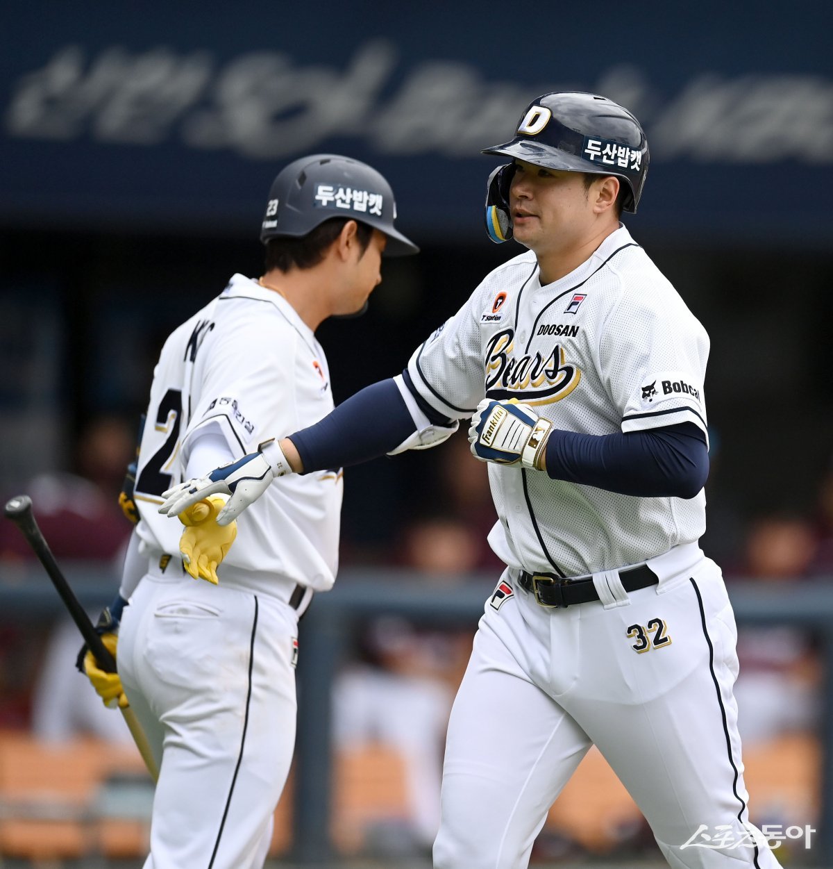 21일 서울 잠실야구장에서 ‘2024 신한은행 SOL뱅크 KBO리그’ 키움 히어로즈와 두산 베어스의 DH 1차전 경기가 열렸다. 2회말 무사 두산 김재환이 우월 솔로 홈런을 날리고 그라운드를 돌아 홈인해 하이파이브 하고 있다.