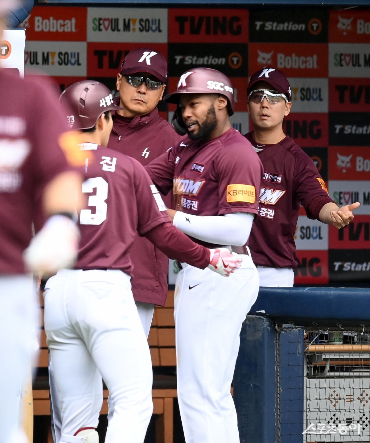 21일 서울 잠실야구장에서 ‘2024 신한은행 SOL뱅크 KBO리그’ 키움 히어로즈와 두산 베어스의 DH 1차전 경기가 열렸다. 1회초 무사 3루 키움 내야 땅볼 때 키움 3루주자 도슨이 홈으로 달려 세이프 된 후 홍원기 감독의 축하를 받고 있다.