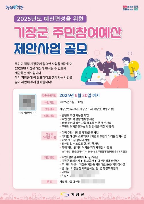 부산 기장군(군수 정종복)이 오는 6월 30일까지 ‘기장군 주민참여예산 제안사업’을 공모한다고 22일 밝혔다.군민이 직접 예산편성 과정 참여
