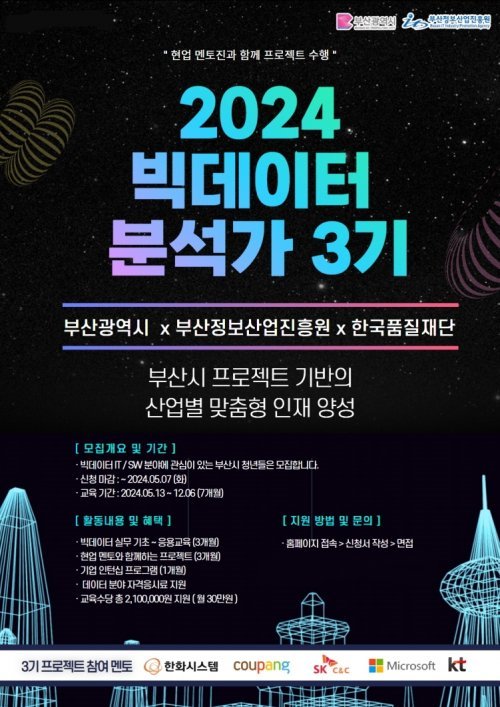 ‘2024 빅데이터 분석가 3기’ 교육과정은 올해 부산시 프로젝트 기반의 산업별 맞춤형 인재양성 사업이다. 내달 7일까지 교육생을 모집하며 전공 유무와 상관없이 지역 빅데이터 분야 취업을 희망하는 청년이라면 누구나 참여 가능하다.