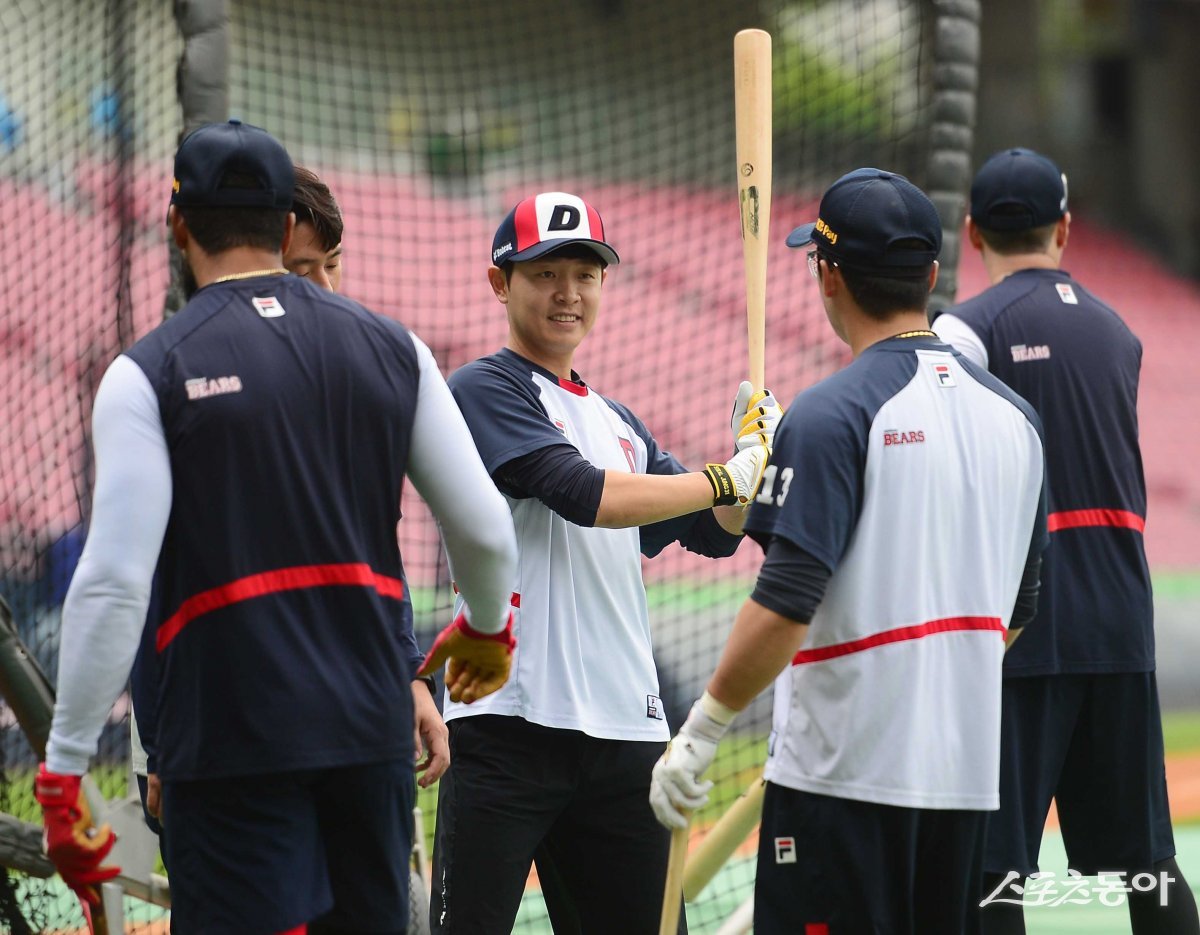 23일 서울 잠실야구장에서 열린 ‘2024 신한 SOL 뱅크 KBO리그’ 두산 베어스와 NC 다이노스의 경기에 앞서 두산 정수빈이 동료와 이야기를 하고 있다.