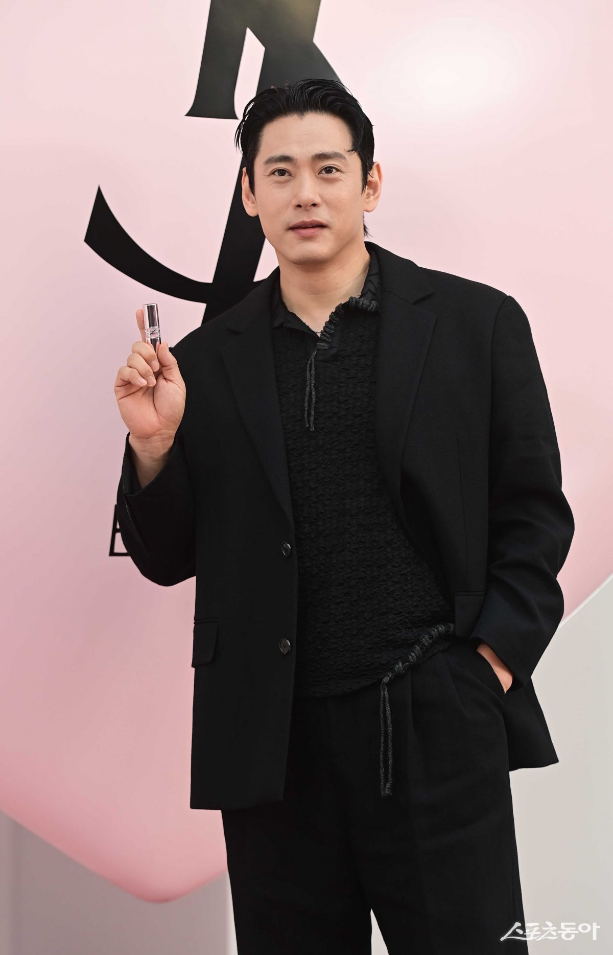 배우 유태오가 24일 서울 성동구 성수동 엠프티에서 열린 한 코스메틱 브랜드의 신제품 팝업 스토어 포토콜에서 포즈를 취하고 있다.