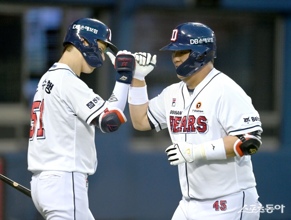 24일 서울 잠실야구장에서 ‘2024 신한은행 SOL뱅크 KBO리그’ NC 다이노스와 두산 베어스 경기가 열렸다. 3회말 1사 두산 김기연이 좌월 솔로 홈런을 날리고 그라운드를 돌아 홈인해 하이파이브 하고 있다.