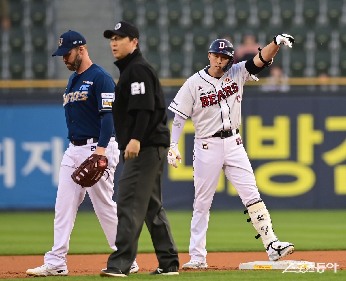 25일 서울 잠실야구장에서 열린 ‘2024 신한 SOL 뱅크 KBO리그’ 두산 베어스와 NC 다이노스의 경기에서 1회말 1사 만루 두산 양석환이 선제 2타점 좌전 2루타를 친 후 세리머니를 하고 있다.