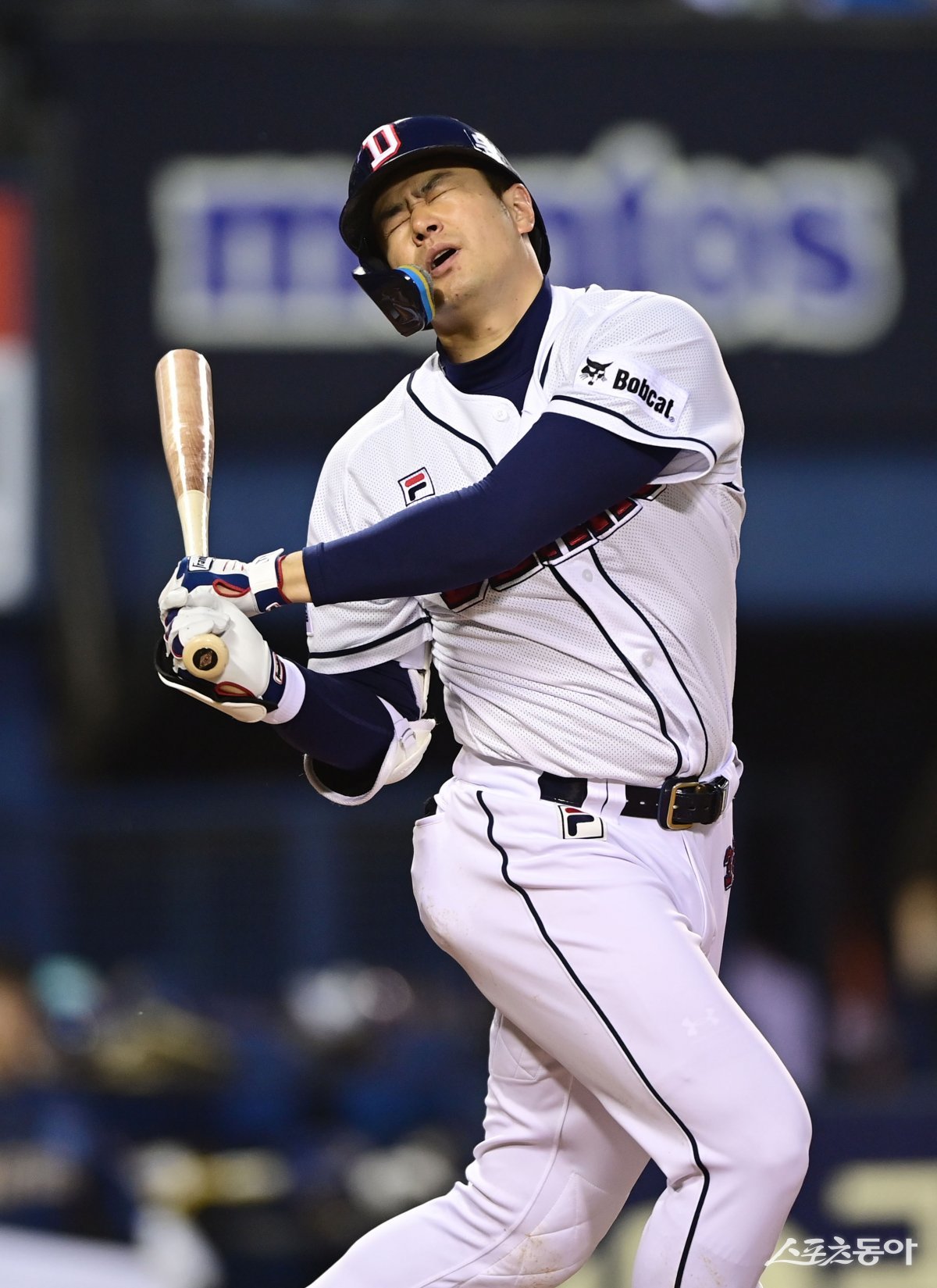 25일 서울 잠실야구장에서 열린 ‘2024 신한 SOL 뱅크 KBO리그’ 두산 베어스와 NC 다이노스의 경기에서 3회말 무사 두산 김재환이 삼진 아웃을 당하며 아쉬워하고 있다.