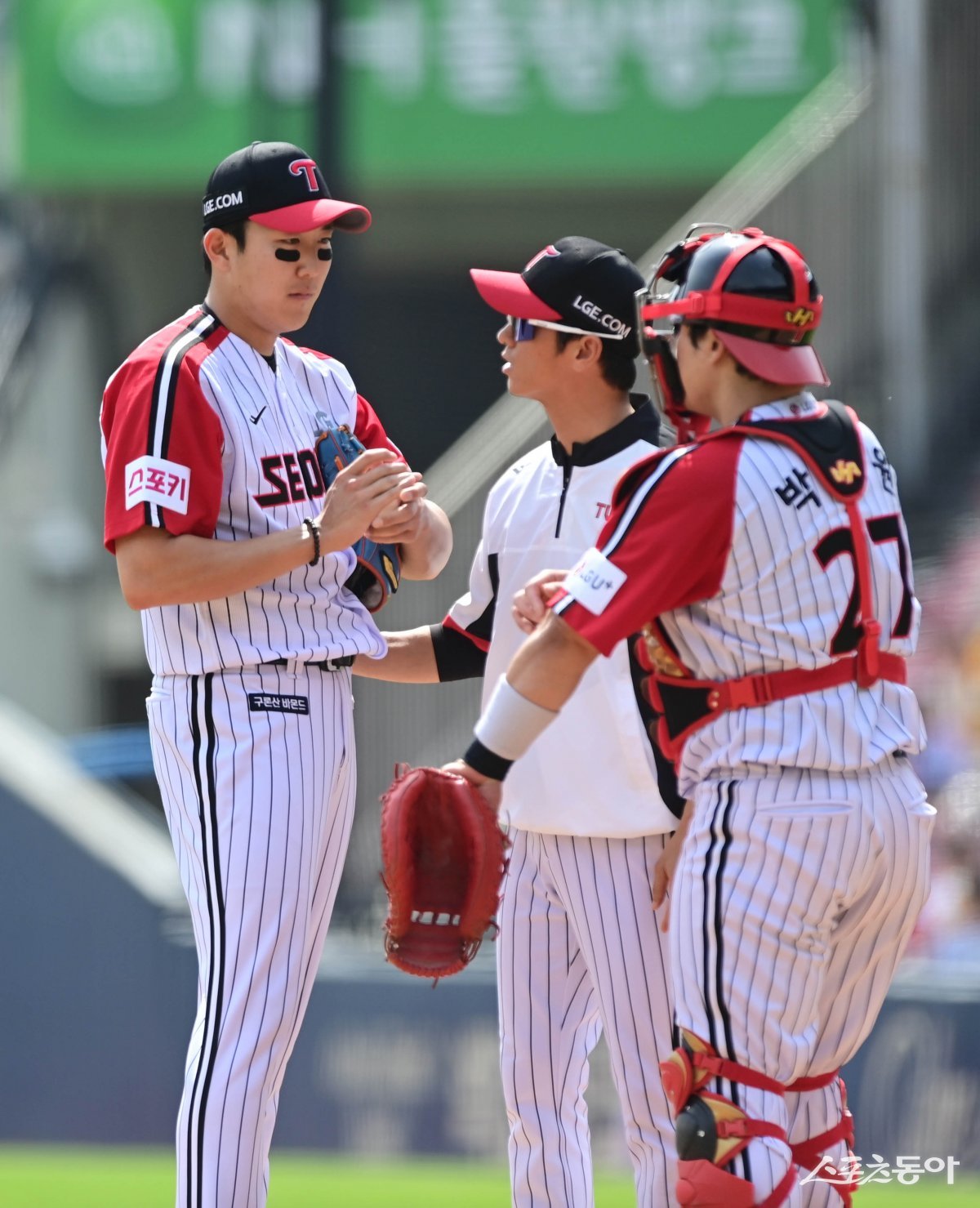 28일 서울 잠실야구장에서 열린 ‘2024 신한 SOL 뱅크 KBO리그’ LG 트윈스와 KIA 타이거즈의 경기에서 4회초 1사 1, 3루 상황에서 LG 손주영이 코치와 이야기를 하고 있다.