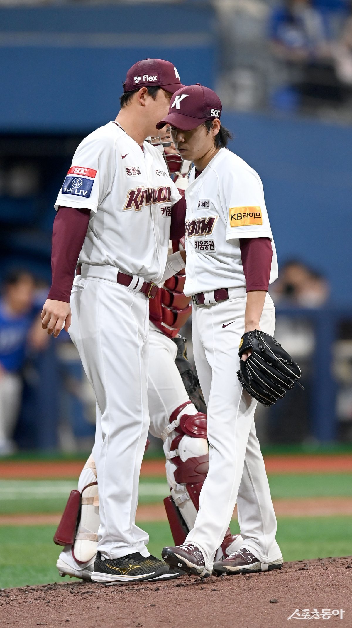28일 서울 고척스카이돔에서 ‘2024 신한은행 SOL뱅크 KBO리그’ 삼성 라이온즈와 키움 히어로즈 경기가 열렸다. 선발 투수로 등판한 키움 하영민이 4회초 1사 1,2루 상황에서 교체되고 있다.