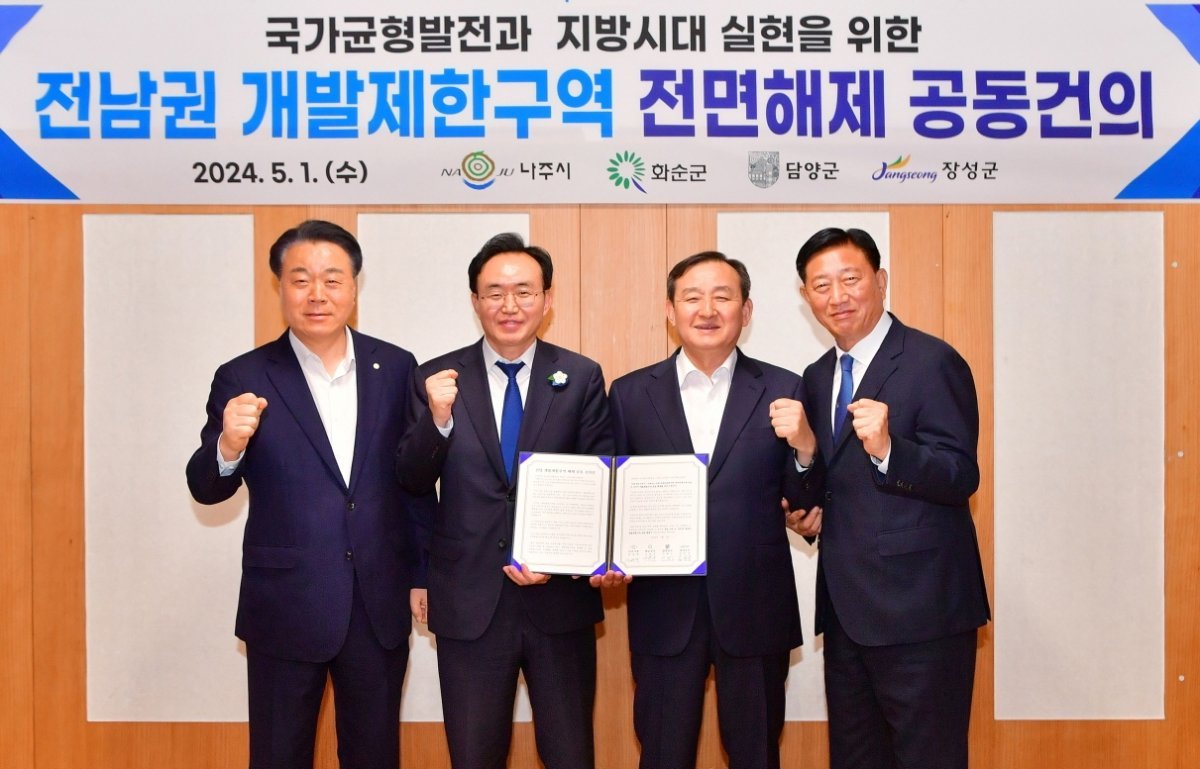 공동건의문 서명 및 발표에 나선 김한종 장성군수와 윤병태 나주시장, 이병노 담양군수, 구복규 화순군수는 “개발제한구역 제도가 도입 초기에는 대도시의 무분별한 팽창을 막는 등 도움을 줬지만, 오늘날에는 지역 발전을 저해하는 장애 요소”라고 짚었다.